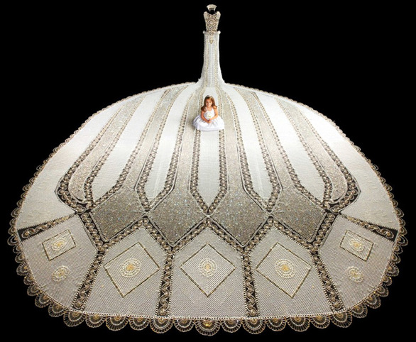 Η ιδέα για το συγκεκριμένο νυφικό ήρθε στη Gail Be πριν 13 χρόνια. Για περισσότερα από τρία χρόνια η Gail Be και άλλες 23 γυναίκες ήταν κλεισμένες σε μια αποθήκη της Μινεσότα ράβοντας το συγκεκριμένο νυφικό. Αν το υπολογίσουμε σε εργατοώρες είναι περίπου 20.000. Και αφού ξεκινήσαμε να μιλάμε για αριθμούς το συγκεκριμένο νυφικό έχει 500.000 πέρλες και πάνω από 400.000 κρυστάλλους Swarovski ενώ είναι νούμερο 4 και το βάρος του φτάνει τα 200 κιλά, γι αυτό και είναι δύσκολο να περπατήσει κάποια γυναίκα μέσα σε αυτό καθώς είναι πολύ βαρύ.